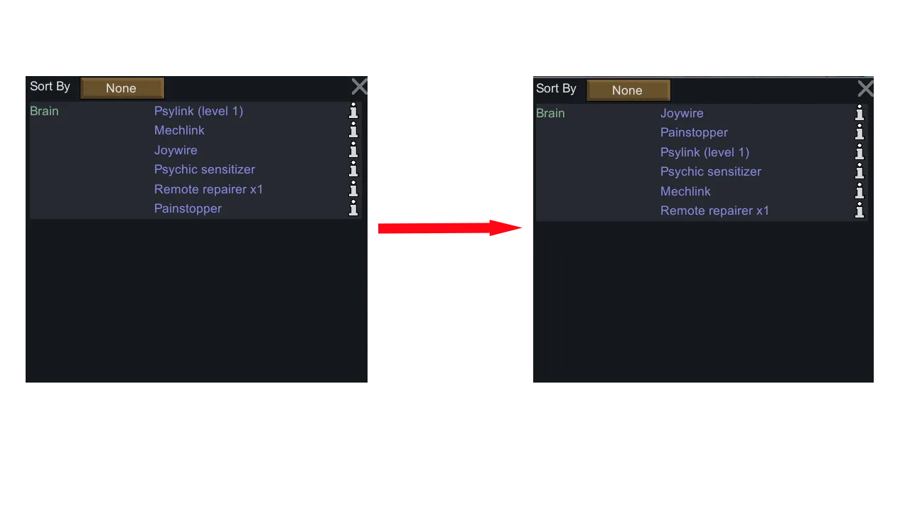 Also you can sort them manually. Manually sorted hediffs won't lose their orders even if you set sort mode back to none.