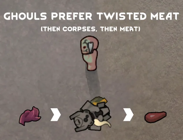 Ghouls prefer Twisted Meat, then human meat, then insect meat, then humanlike corpses, then insect corpses, then animal meat, then animal corpses.