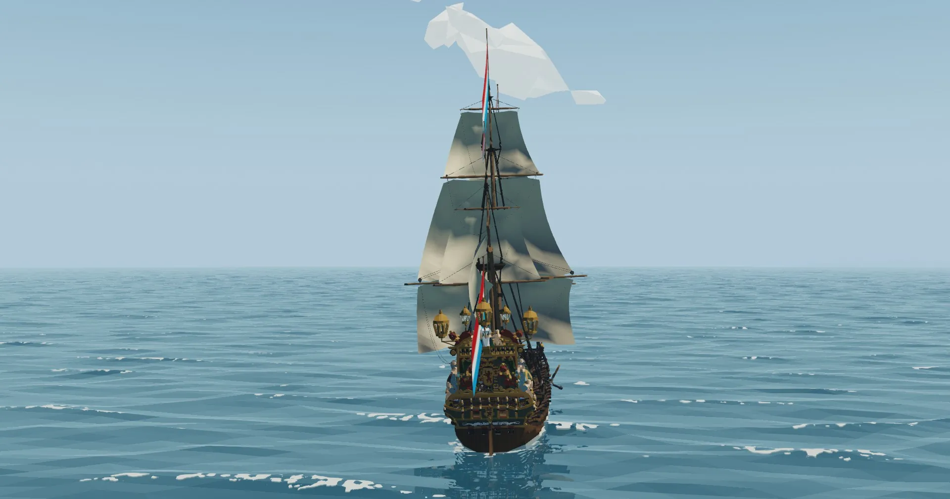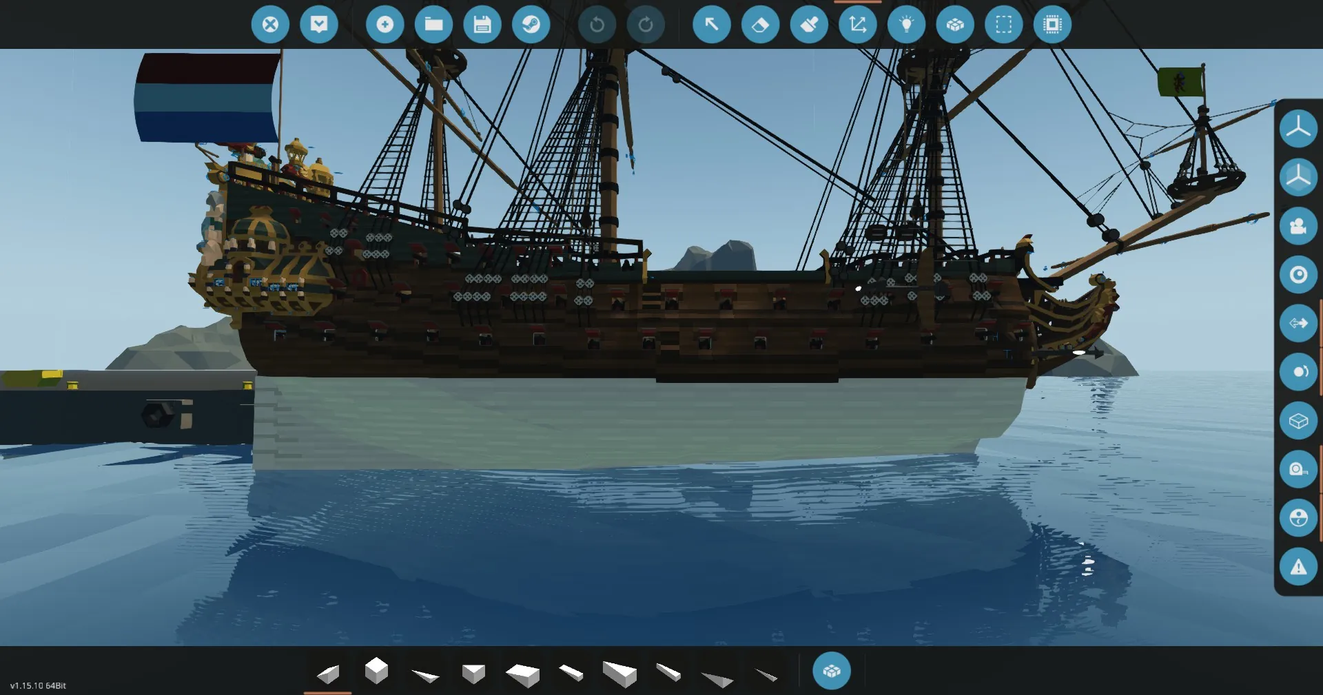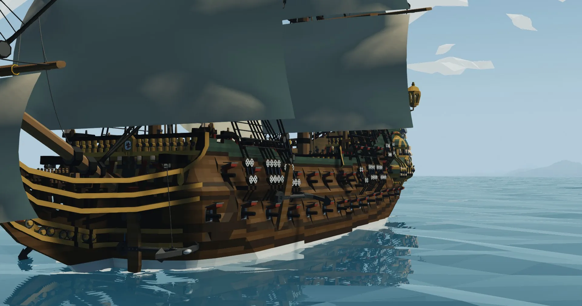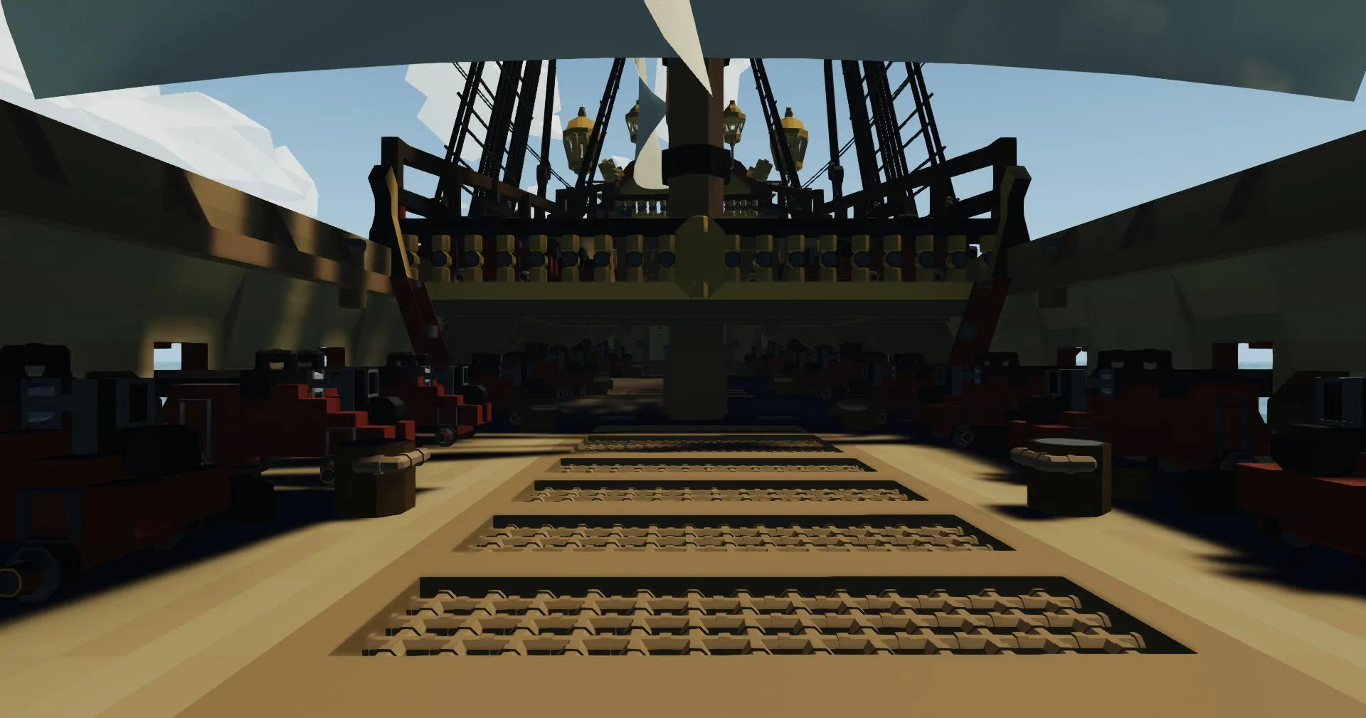De Zeven Provinciën requires either a modded workbench or a mission in order to spawn due to her size. Once spawned, she may be controlled via the whipstaff (a large pole) towards her stern on the upper gundeck. You may control yards, the mizzen sail, the rudder, and lights throughout the ship from here. IMPORTANT: to furl and unfurl the sails, go to the fife rails located at the base of the fore and main masts (these are on the fo'c'sle and the quarterdeck respectively). All sails on the ship have the ability to be raised and lowered individually from these fife rails. All decks are accessible via multiple stairwells and/or ladders, many of which require crouching to traverse properly.