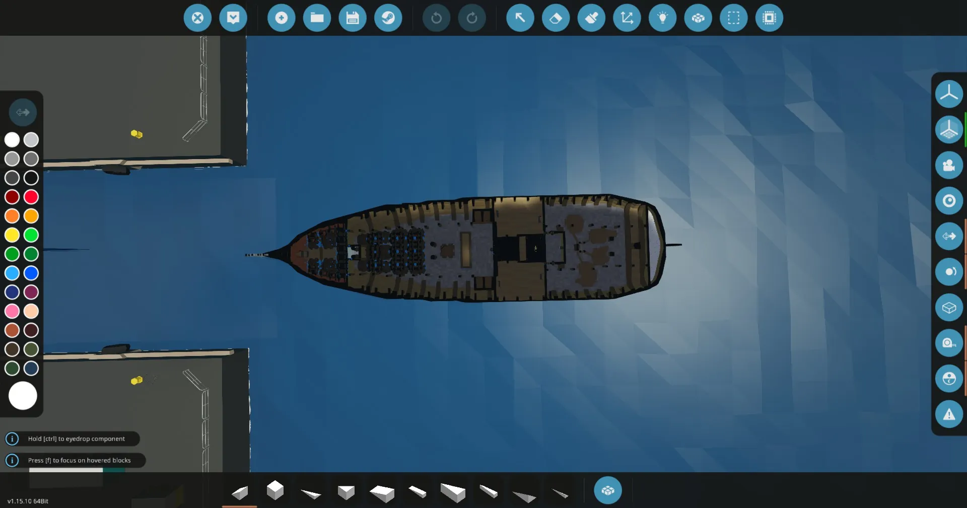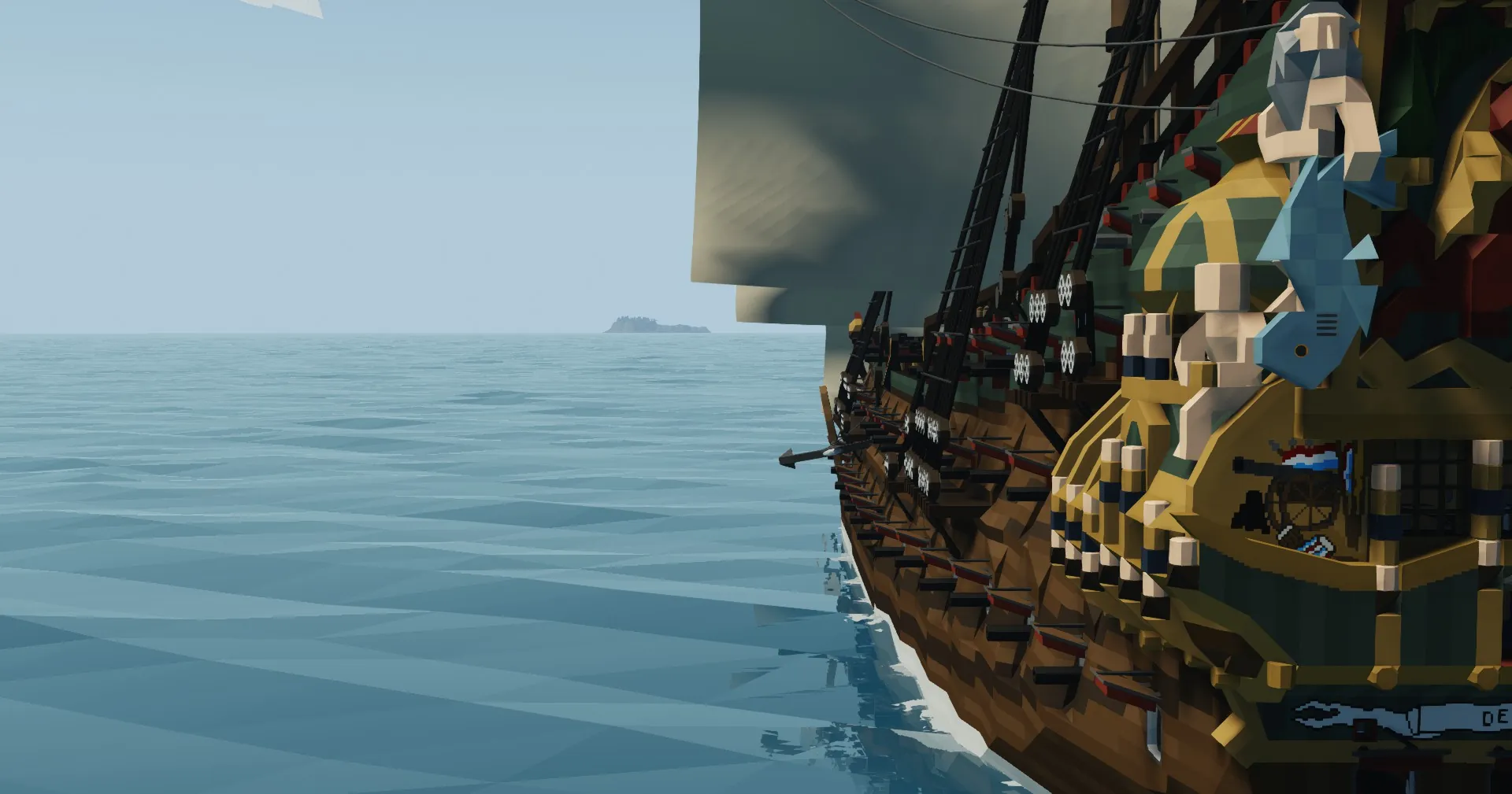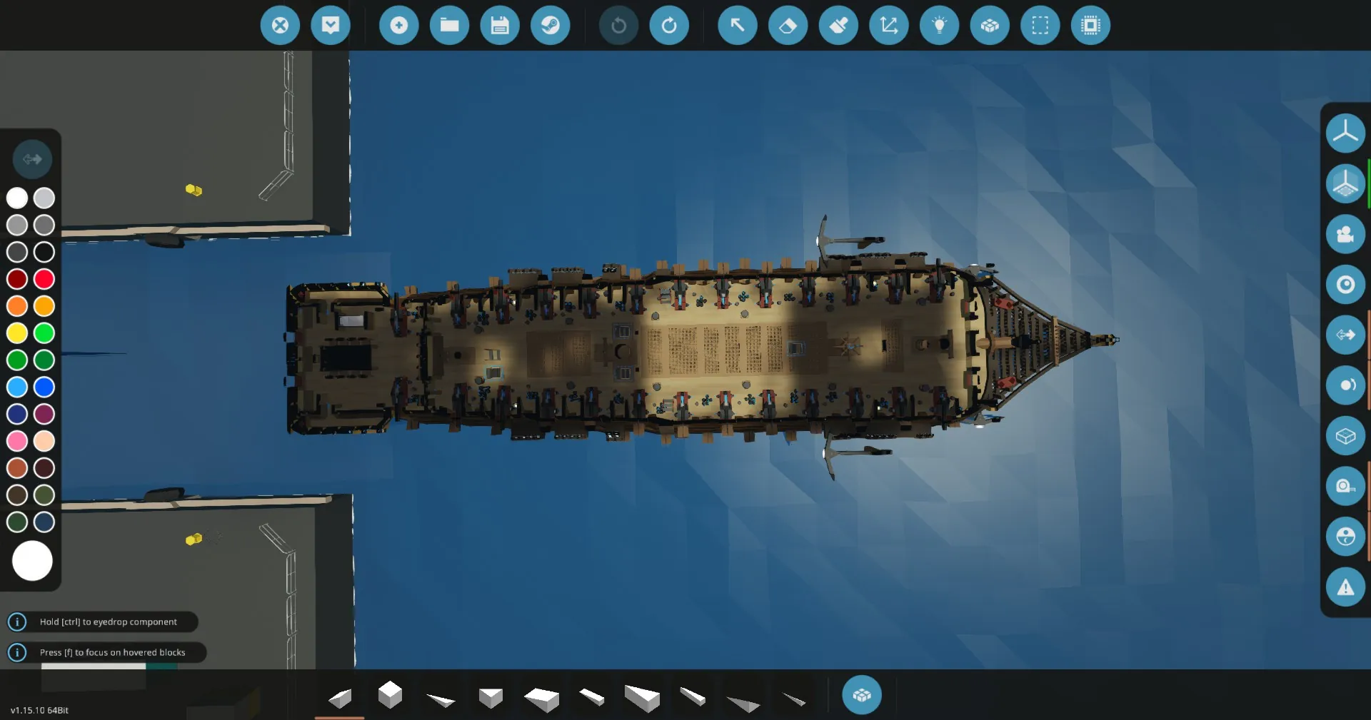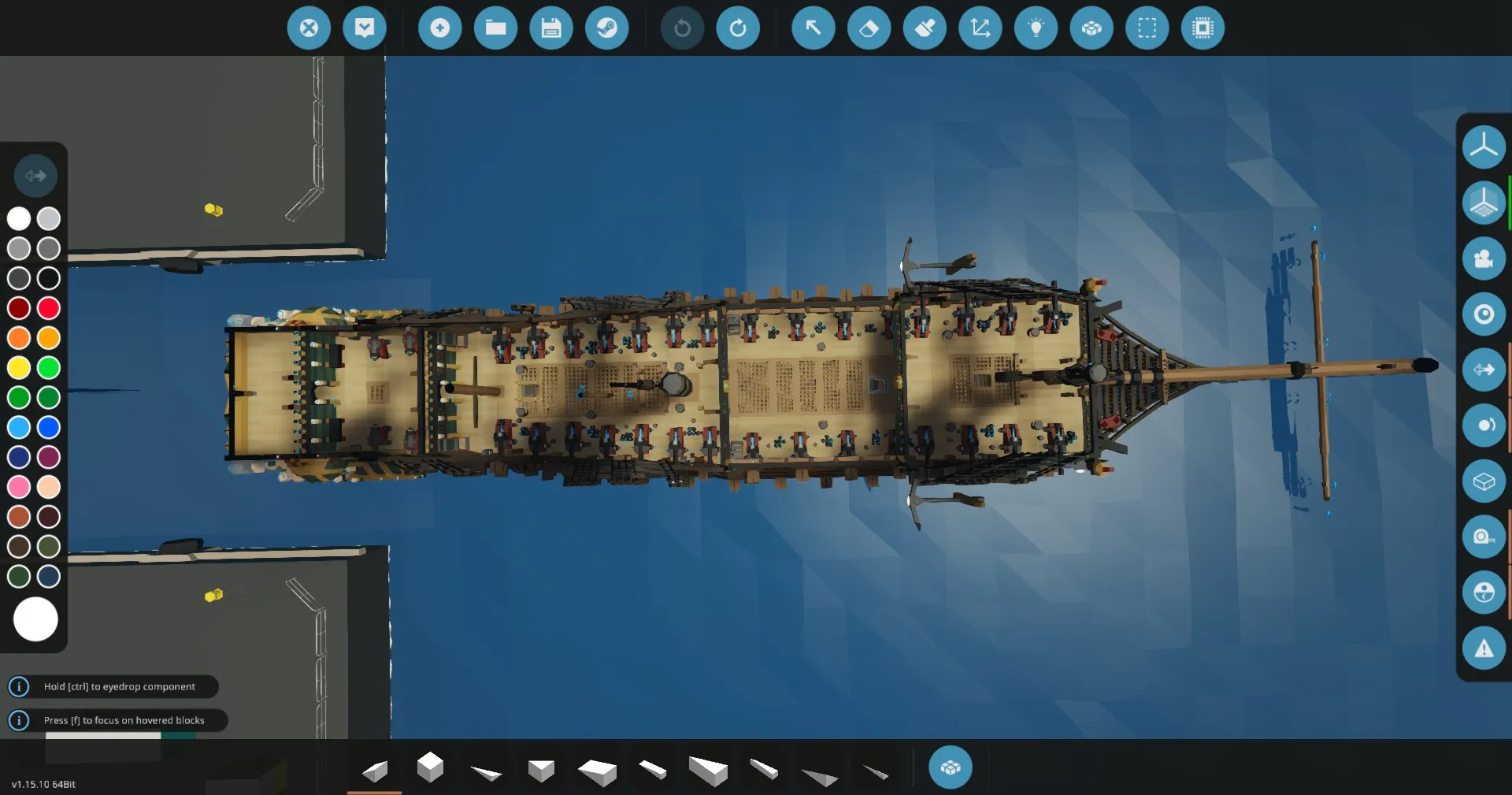 De Zeven Provinciën requires either a modded workbench or a mission in order to spawn due to her size. Once spawned, she may be controlled via the whipstaff (a large pole) towards her stern on the upper gundeck. You may control yards, the mizzen sail, the rudder, and lights throughout the ship from here. IMPORTANT: to furl and unfurl the sails, go to the fife rails located at the base of the fore and main masts (these are on the fo'c'sle and the quarterdeck respectively). All sails on the ship have the ability to be raised and lowered individually from these fife rails. All decks are accessible via multiple stairwells and/or ladders, many of which require crouching to traverse properly.