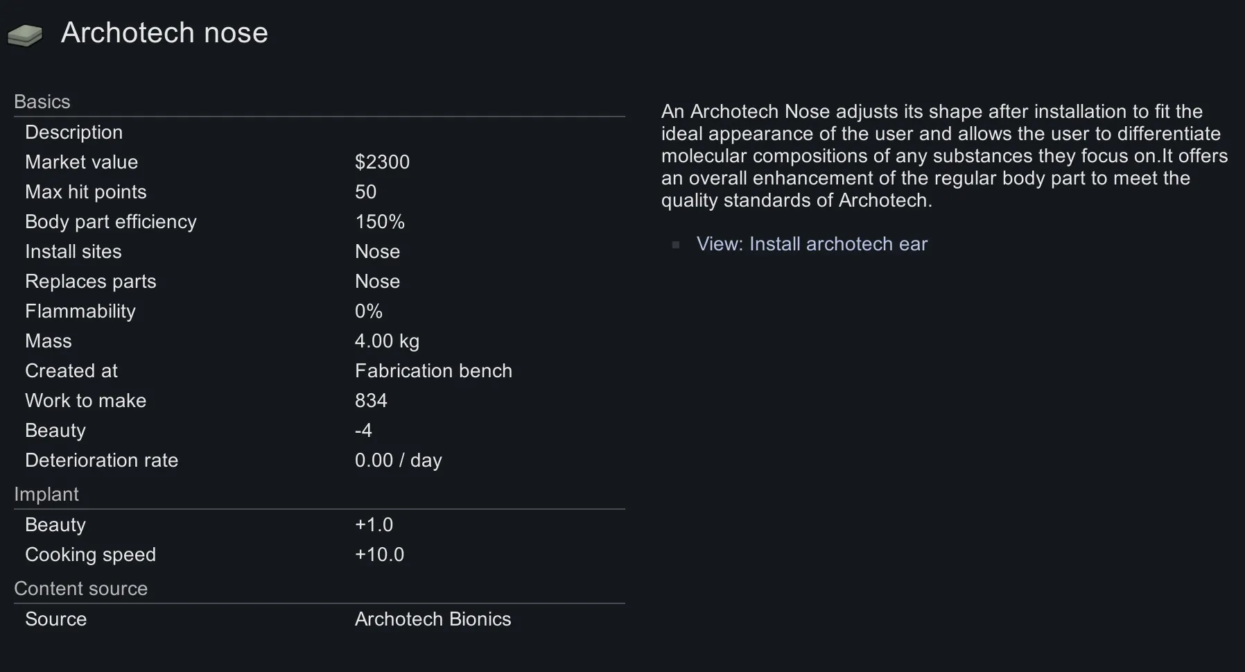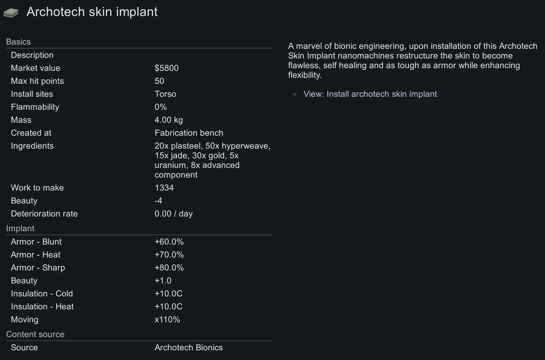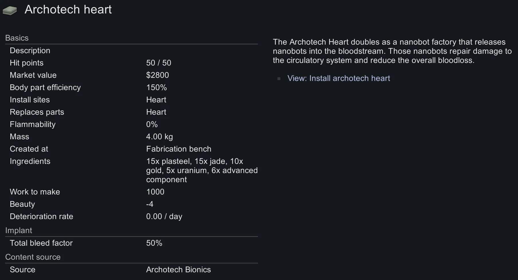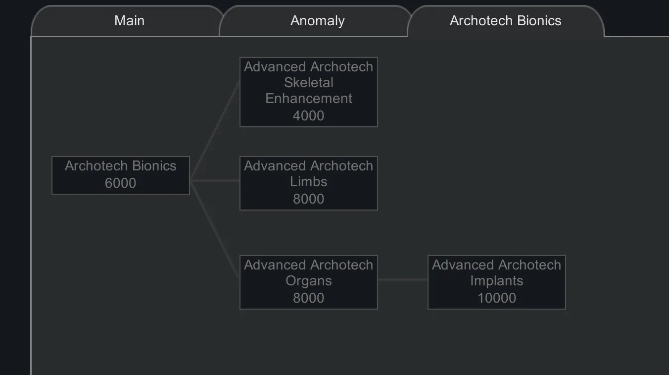 This mod allows for researching the crafting of regular Archotech Prosthetics (Eye, Arm, Leg).