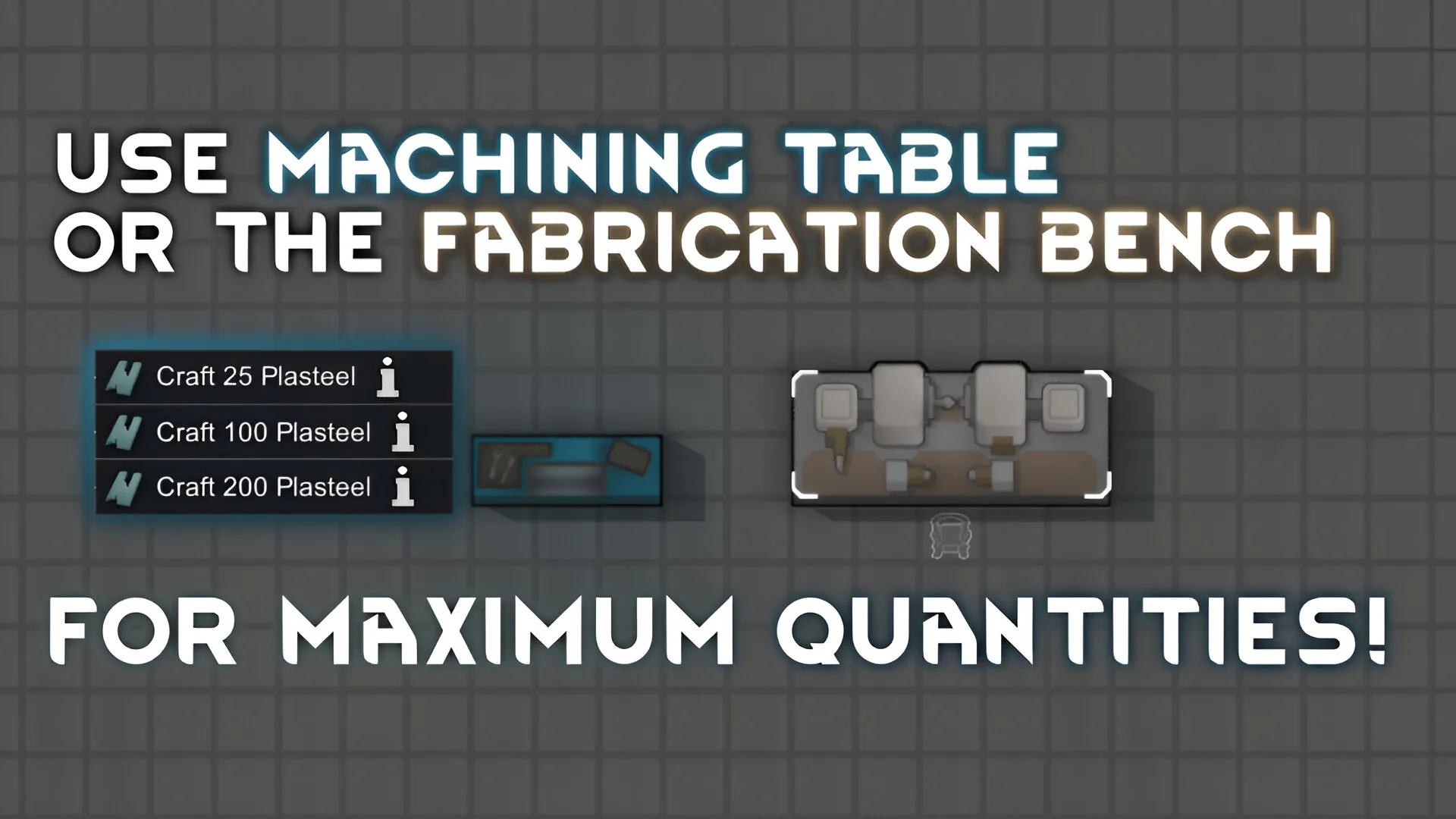 Once unlocked, the Machining Table and Fabrication Bench offer crafting recipes for plasteel in quantities of x25, x100, and x200. The Refinery enables crafting in batches of x25 and x100.
