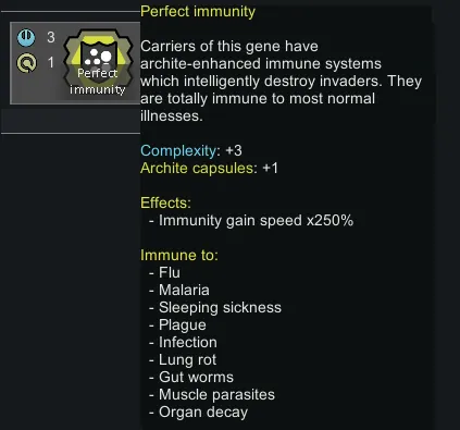 Gives the Perfect Immunity archite gene 2.5x immunity gain speed, up from no multiplier (1.0x).
