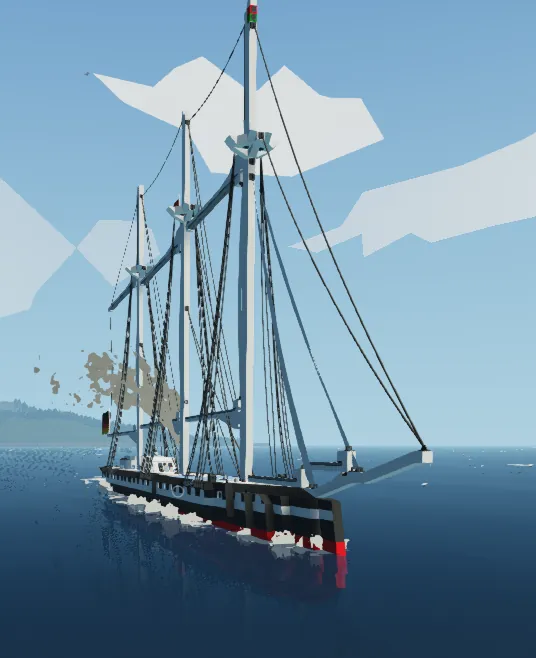 ThisSchooner functions as a yacht. With it´s Rigging it is Possible to sail on close Hauled Courses of about 5°-10° to the Wind with a reasonable Speed.