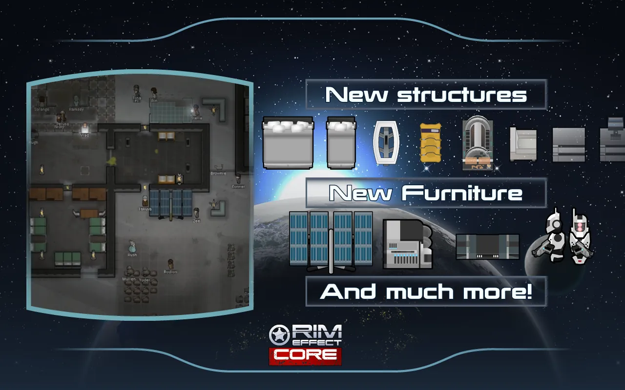 Rim Effect Core is the primary module for this mod series, upon which all other sub-modules will depend. Core module introduces a brand new ultratech faction - Systems Alliance, with their own planet-side bases, apparel, weapons, backstories and structures. It’s certainly the biggest mod ever made by us, and potentially the biggest mod on the workshop right now, featuring dozens of new structures, multiple new power sources, an in-depth ability system with tech and biotic powers, lots of new weapons, apparel, animals and other unique mechanics.