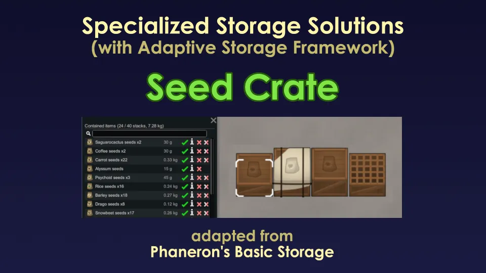 The seed crate is inspired by and adapted from [url=https://steamcommunity.com/sharedfiles/filedetails/?id=3201536200]Phaneron's Basic Storage[/url], and it depends on the [url=https://steamcommunity.com/sharedfiles/filedetails/?id=3033901359]Adaptive Storage Framework[/url].