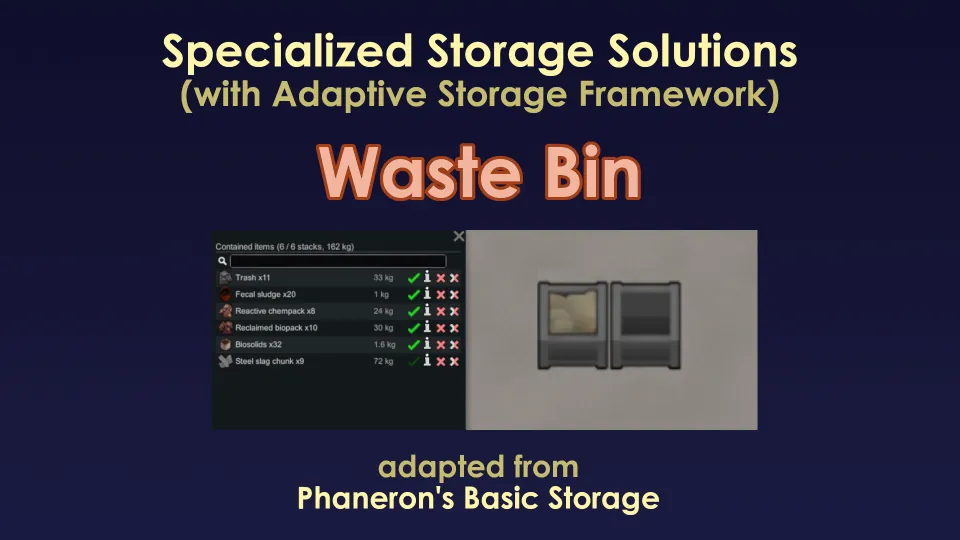 The waste bin is inspired by and adapted from [url=https://steamcommunity.com/sharedfiles/filedetails/?id=3201536200]Phaneron's Basic Storage[/url] and depends on the [url=https://steamcommunity.com/sharedfiles/filedetails/?id=3033901359]Adaptive Storage Framework[/url].