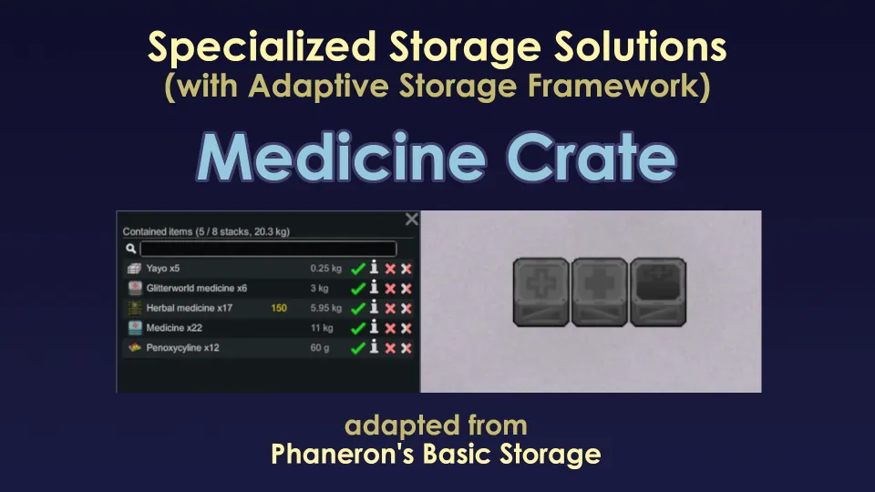 The medicine crate is inspired by and adapted from [url=https://steamcommunity.com/sharedfiles/filedetails/?id=3201536200]Phaneron's Basic Storage[/url], and it depends on the [url=https://steamcommunity.com/sharedfiles/filedetails/?id=3033901359]Adaptive Storage Framework[/url].