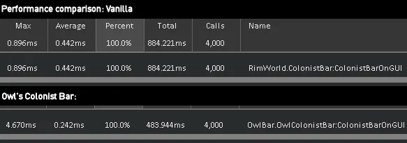 [*] [b]High performance:[/b] Rewritten from the ground up, performing twice as fast as the vanilla bar. The importance of performance scales up the more colonists you have rendered in the bar.