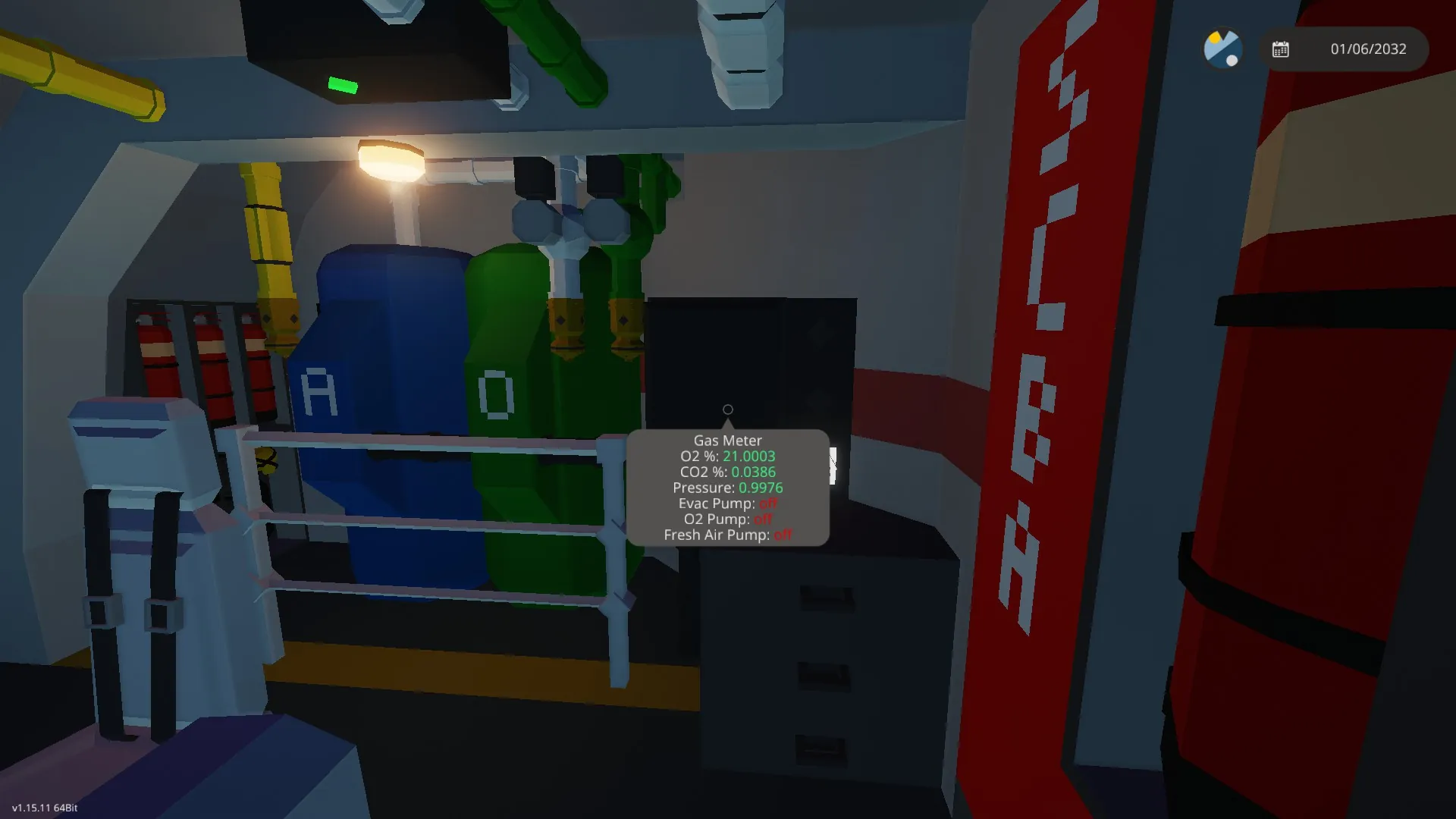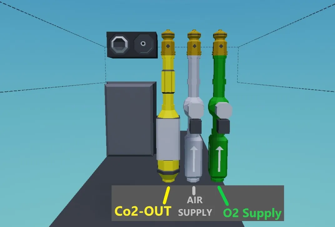 After this has happened it will remove the C02 and replace the oxygen. The system will regulate pressure as well as O2 and CO2 levels automatically. You need to give it a supply of Fresh oxygen to the green and Fresh air to the white valves. The Yellow line is to remove the CO2 from the cabin.
