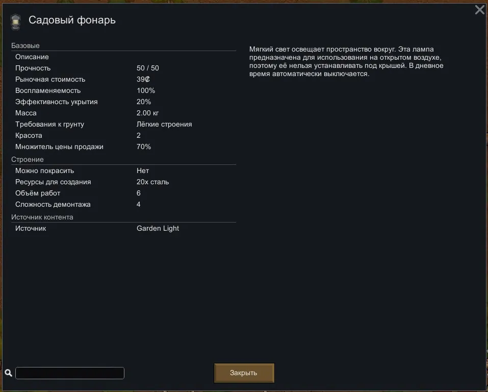 Русский язык для мода Garden Light. Добавляет садовые фонари, которые греют ножки колонистов.
