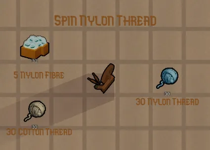 30 [i]Nylon Thread[/i] can be spun on the [i]Spinning Wheel[/i] using 5 Nylon Fibres, and 30 Cotton Thread.
