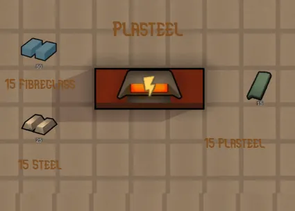 Finally, [i]Plasteel[/i] can be crafted by smelting 15 Fibreglass with 15 Steel. This produces 15 Plasteel.