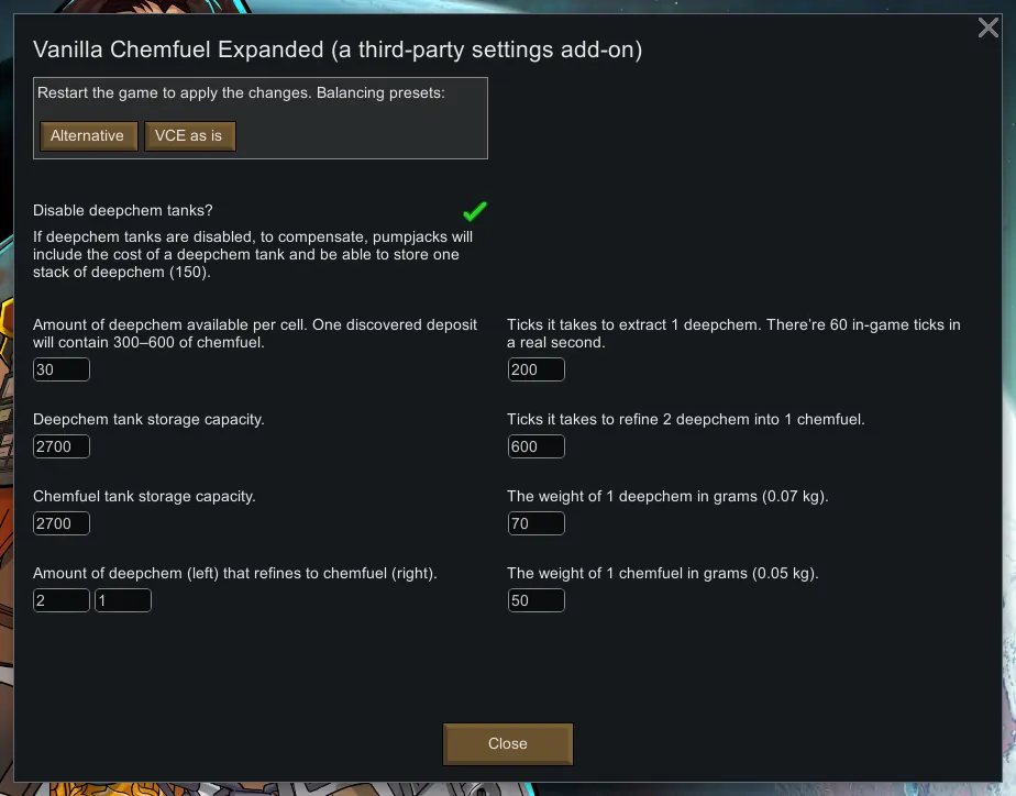 In VCE, a single deepchem deposit yields a colony 18000–36000 chemfuel, which is enough fuel to power 66–132 chemfuel generators (66000W–132000W of power) for a year. This mod adds a settings page for Vanilla Chemfuel Expanded that calculates the numbers for you and offers an alternative balancing preset: