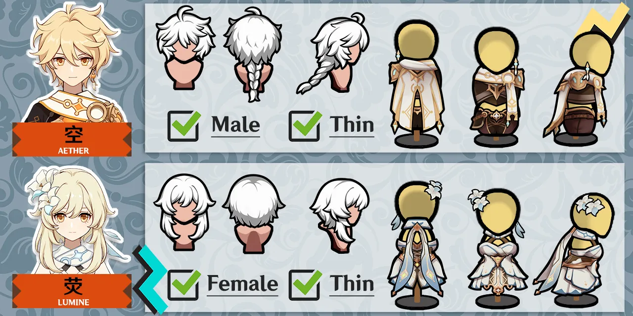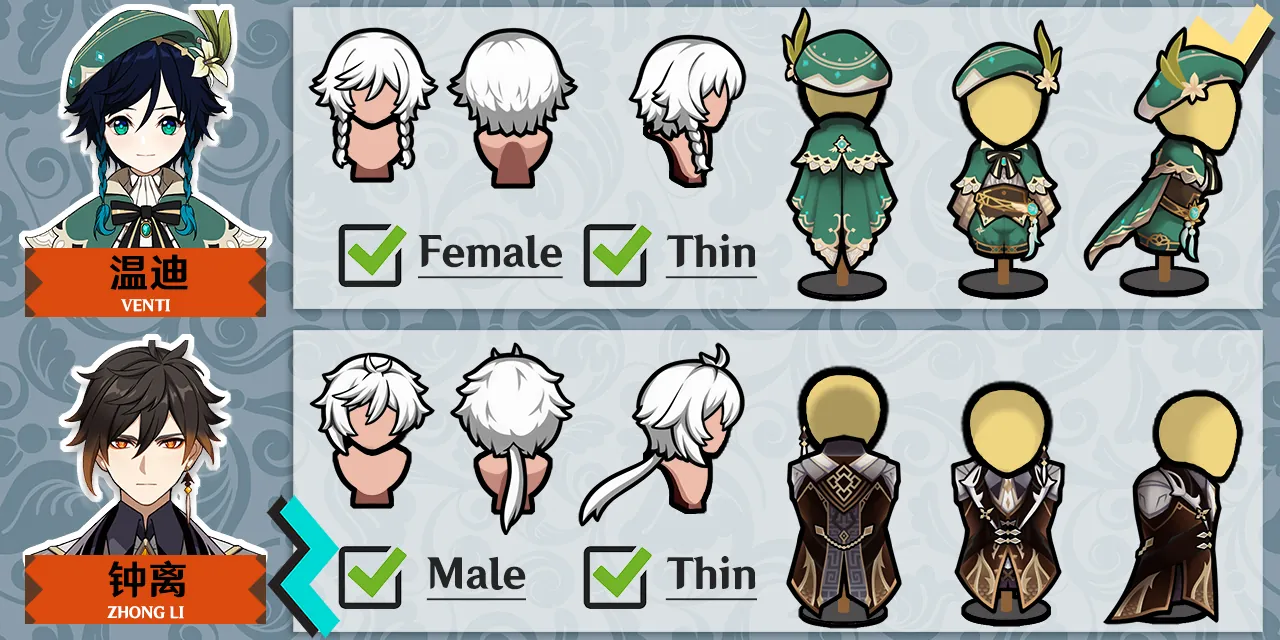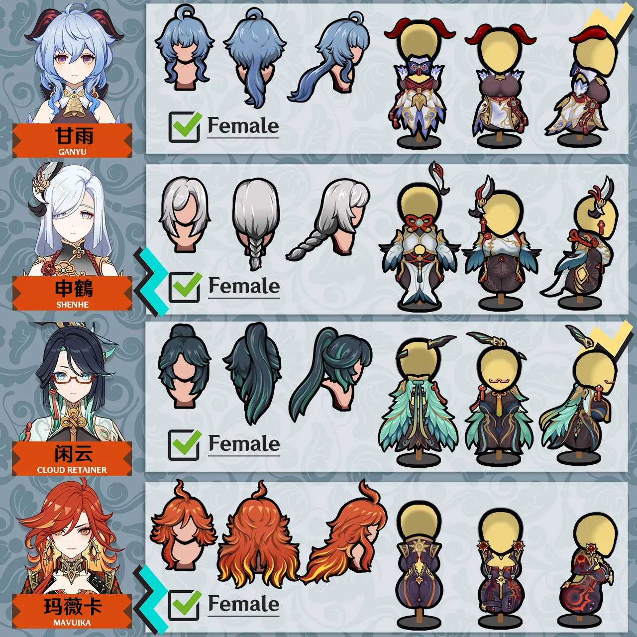 以米哈游的游戏原神里的角色为原型的人物造型包,其中包含有对应人物的头发,头饰与服装。