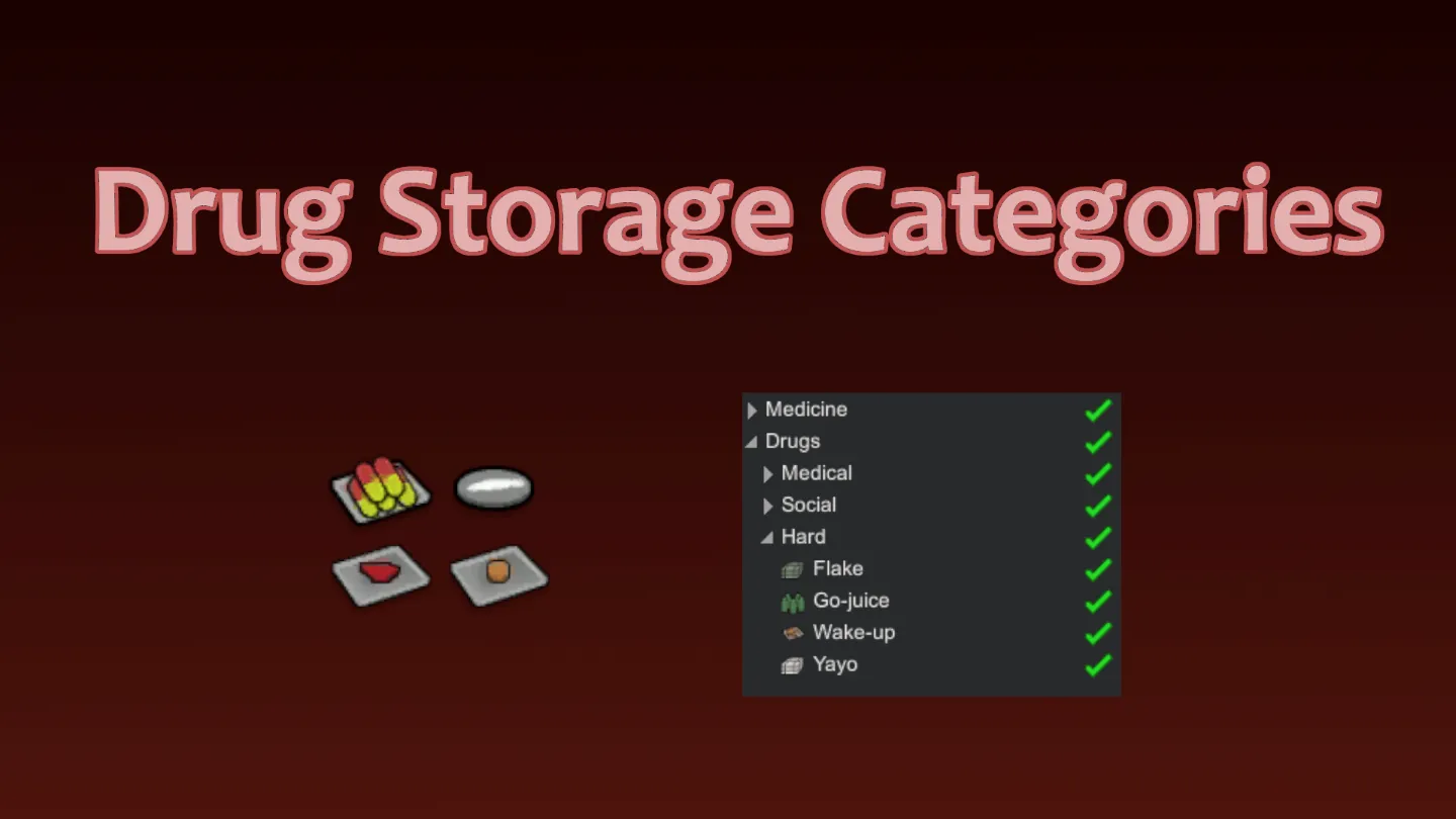 This mod creates storage sub-categories for drugs according to their internal categorization as social/medical/hard drugs and sorts them (including modded ones) into the new storage categories accordingly. It is intended to simplify the process of storing drugs with medical applications separately from those with other purposes. This is especially useful if the number of drugs is increased by mods.