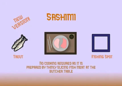 This mod adds sashimi as a light meal to the game. Sashimi is prepared at either a [i]Butcher Spot[/i], or the [i]Butcher Table[/i]. It is not cooked. Sashimi is a tasty treat, but is not a very filling as a meal. It is quick to make, but does not keep very long, so only make what you need.