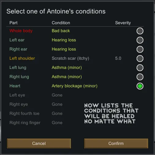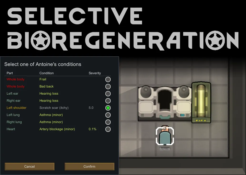 Are you tired of putting your mangled pawns over and over through the lengthy and expencive bioregeneration cycle in hopes of finally fixing that one consciousness reducing neck scar? Don't you think that the veterans of the Rim deserve better? Or that a machine that uses mechanites to heal people at the cellular level should have an options menu? Well fear no longer! With this mod software update, you will be able to tell your biosculpter pod which one of the user's conditions it should heal!