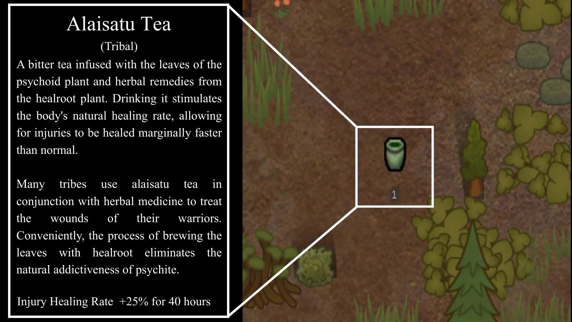 [i]"A bitter tea infused with the leaves of the psychoid plant and herbal remedies from the healroot plant. Drinking it stimulates the body's natural healing rate, allowing for injuries to be healed marginally faster than normal."[/i]