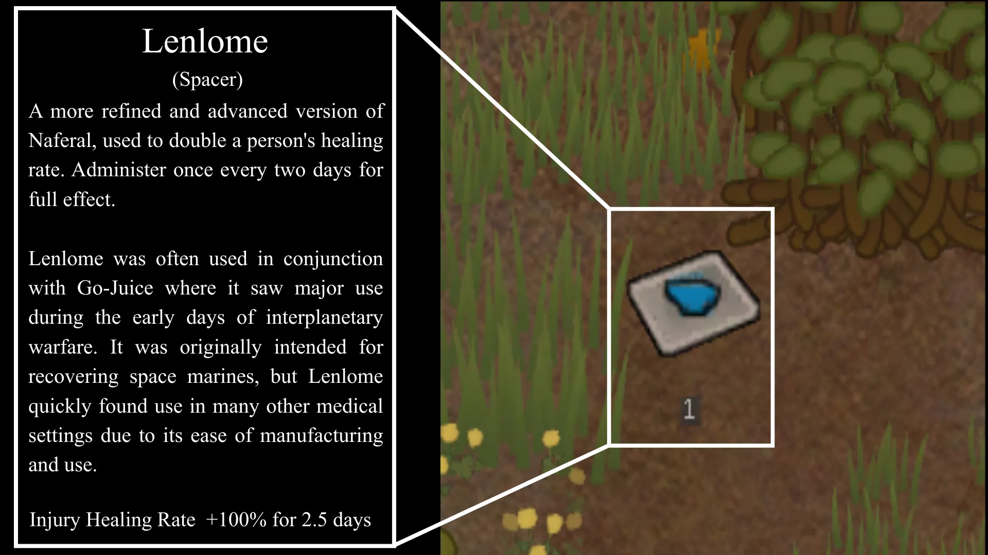 [i]"Lenlome was often used in conjunction with Go-Juice where it saw major use during the early days of interplanetary warfare. It was originally intended for recovering space marines, but Lenlome quickly found use in many other medical settings due to its ease of manufacturing and use."[/i]