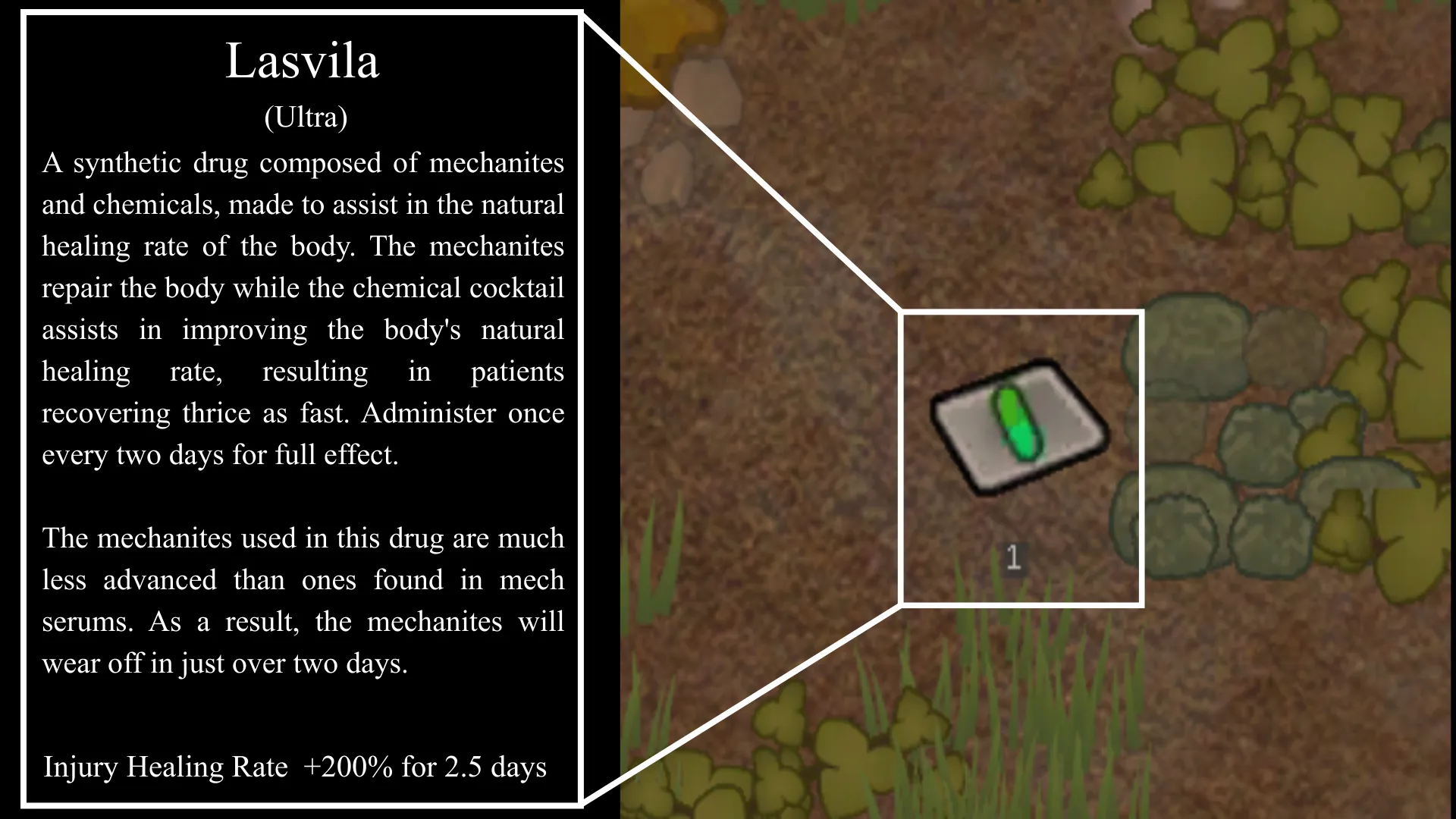Increases a pawn's injury healing factor by 600% and immunity gain speed by 400% for 5 days.