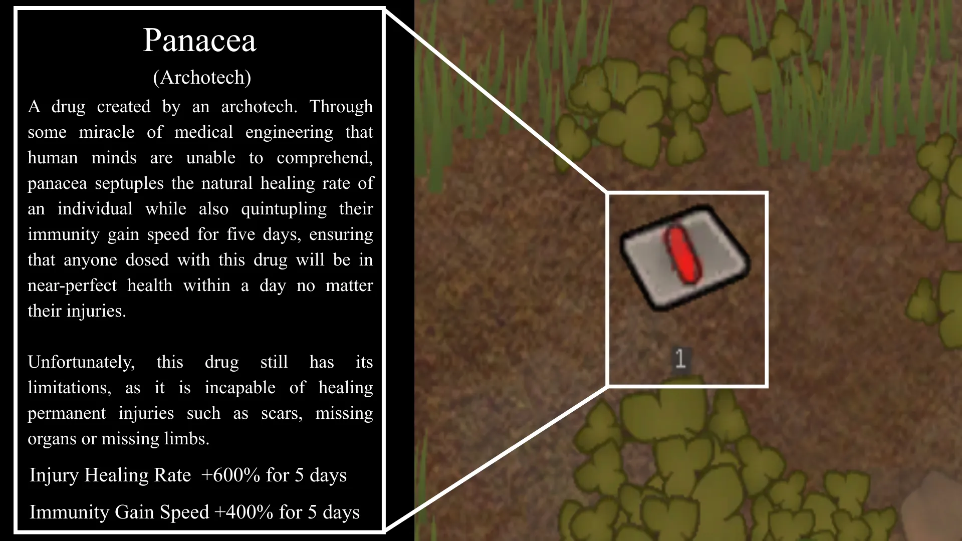 [i]"A drug created by an archotech. Through some miracle of medical engineering that human minds are unable to comprehend, panacea septuples the natural healing rate of an individual while also quintupling their immunity gain speed for five days, ensuring that anyone dosed with this drug will be in near-perfect health within a day no matter their injuries."[/i]