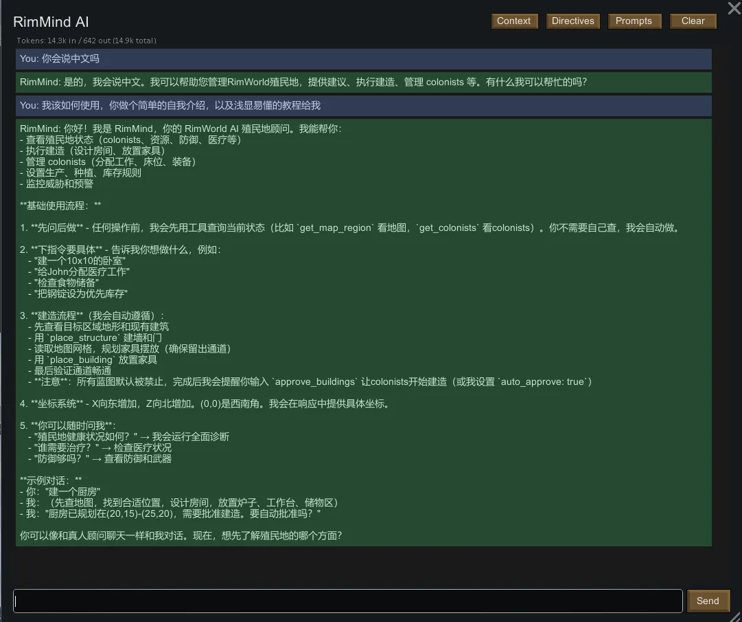 RimMind 边缘AI顾问通过 OpenRouter 将人工智能智能融入你的殖民地。它配备了一个游戏内 AI 聊天伙伴,能够使用 26 种不同工具查询你的殖民地状态——包括殖民者、资源、研究、防御等。这位 AI 顾问对你的殖民地了如指掌,并能协助你做出决策。