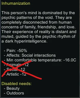 Removes the skill penalty of inhumanization I mostly just made this because I accidentally got my best Artist/social pawn inhumanized, and I'd really prefer if they didn't sudden start sucking. Thought I might aswell upload it.