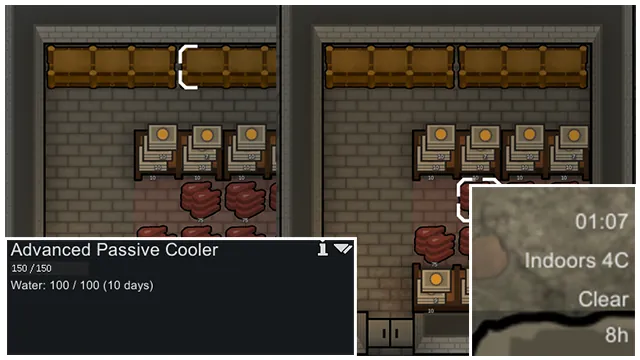 This passive cooler will be able to go down to temperatures of 4°C, effectively refrigerating your meals, meat, etc., making it a great addition to tribal playthroughs. I mostly made this mod for myself since I didn't see any appropriate semi-realistic mods with DBH compatibility.