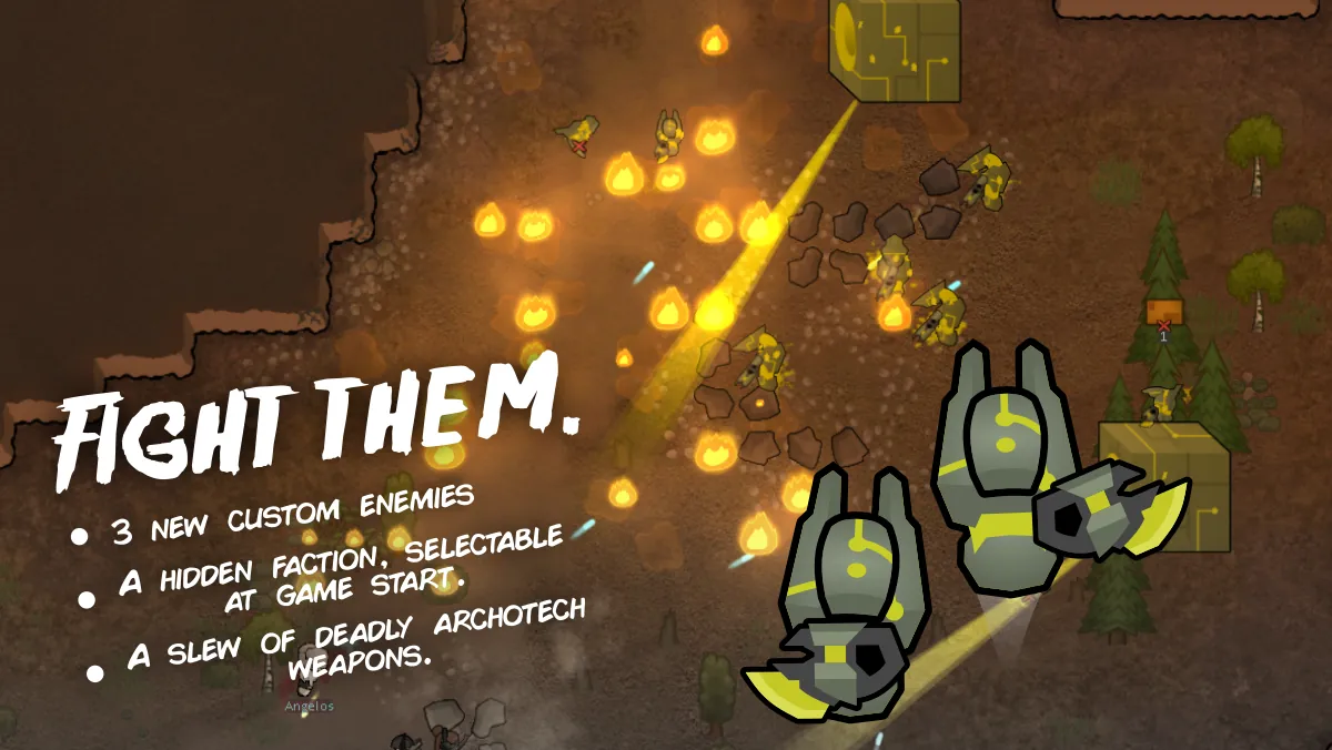A custom faction of archonoids which is selectable at game start, and it's hidden. The faction is made up of 4 different archobeasts which will raid you like mechanoids, but only after 50 days have passed. The archonoids use powerful quantum-foam weapons that scrape the fluctuations in the quantum-foam to fire powerful skipshots that are capable of skipping anything in the blast radius to a far away place. These weapons are extremely lethal, but by killing the archonoids and harvesting them you can make your own versions, much sleeker and more ergonomic, to hold back the archonoid menace.
