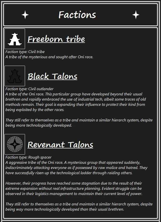 The mysterious horned and feathered humanoid found on some rim worlds, Oni are often sought out by Glitterworlds for their beauty as a sort of exotic pet. Worse still some are kept as livestock for their feathers, pelts and horns, all having practical and decorative uses. Oni do not have a high opinion about clothing due to the uncomfortable sensation on their feathered bodies. However, due to their feathers, they are highly vulnerable to being set on fire.
