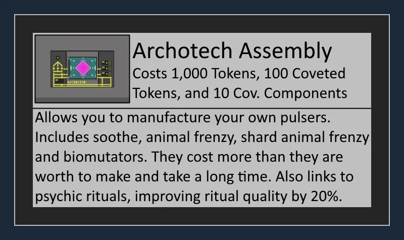 - The Archotech Assembly: allows you to build various psychic pulsers.