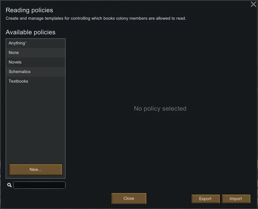 This mod adds the ability to import and export apparel, food, drugs and reading policy collections so they can easily be shared between saves.
