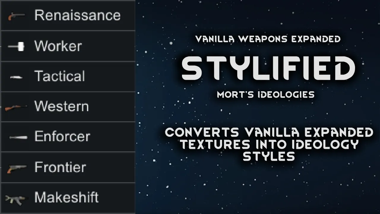 Are you a big fan of the textures from Vanilla Weapons Expanded, but don't want to actually keep track of a bunch of versions of the vanilla guns with moderately different stats? Enter Stylified! This mod adds Ideology styles to retexture vanilla weapons using the VE textures, allowing you to enjoy the visuals from the fine folks at Vanilla Expanded while maintaining vanilla weapon balance.