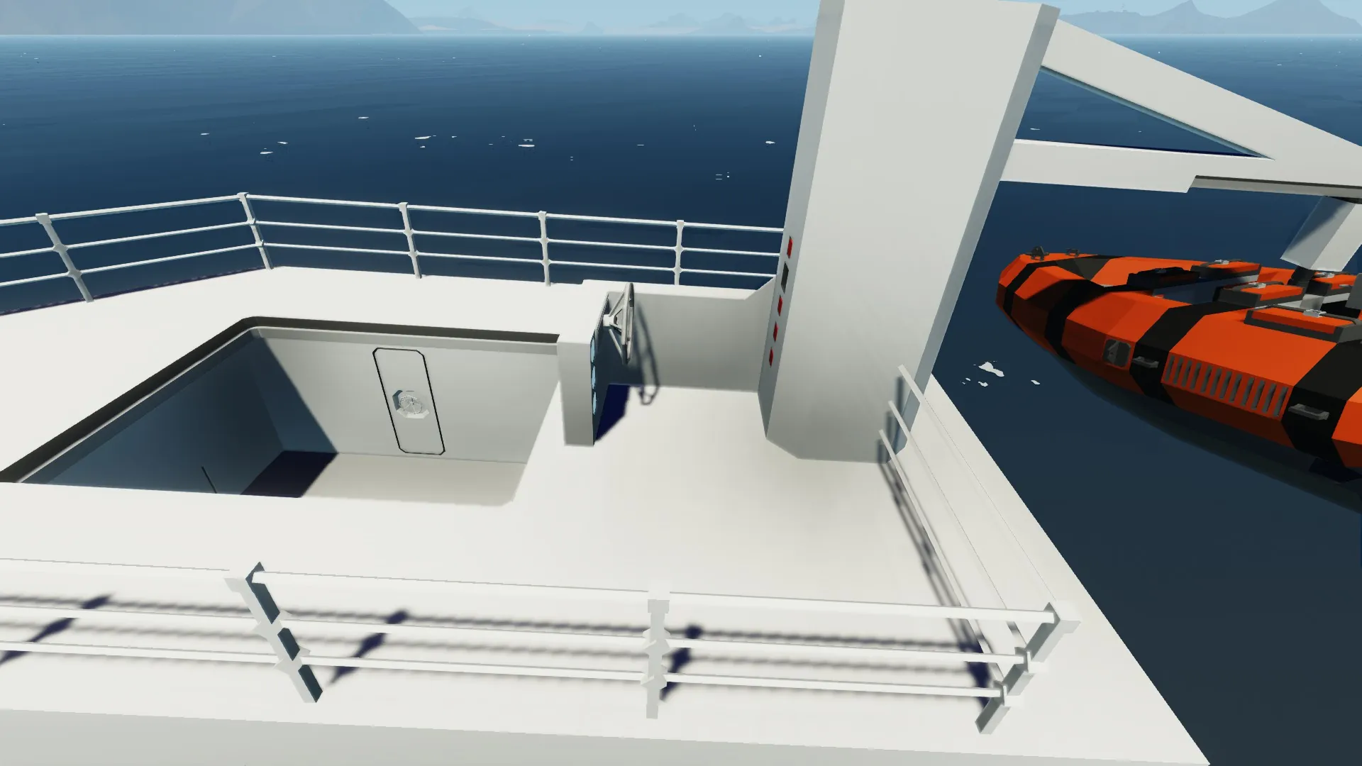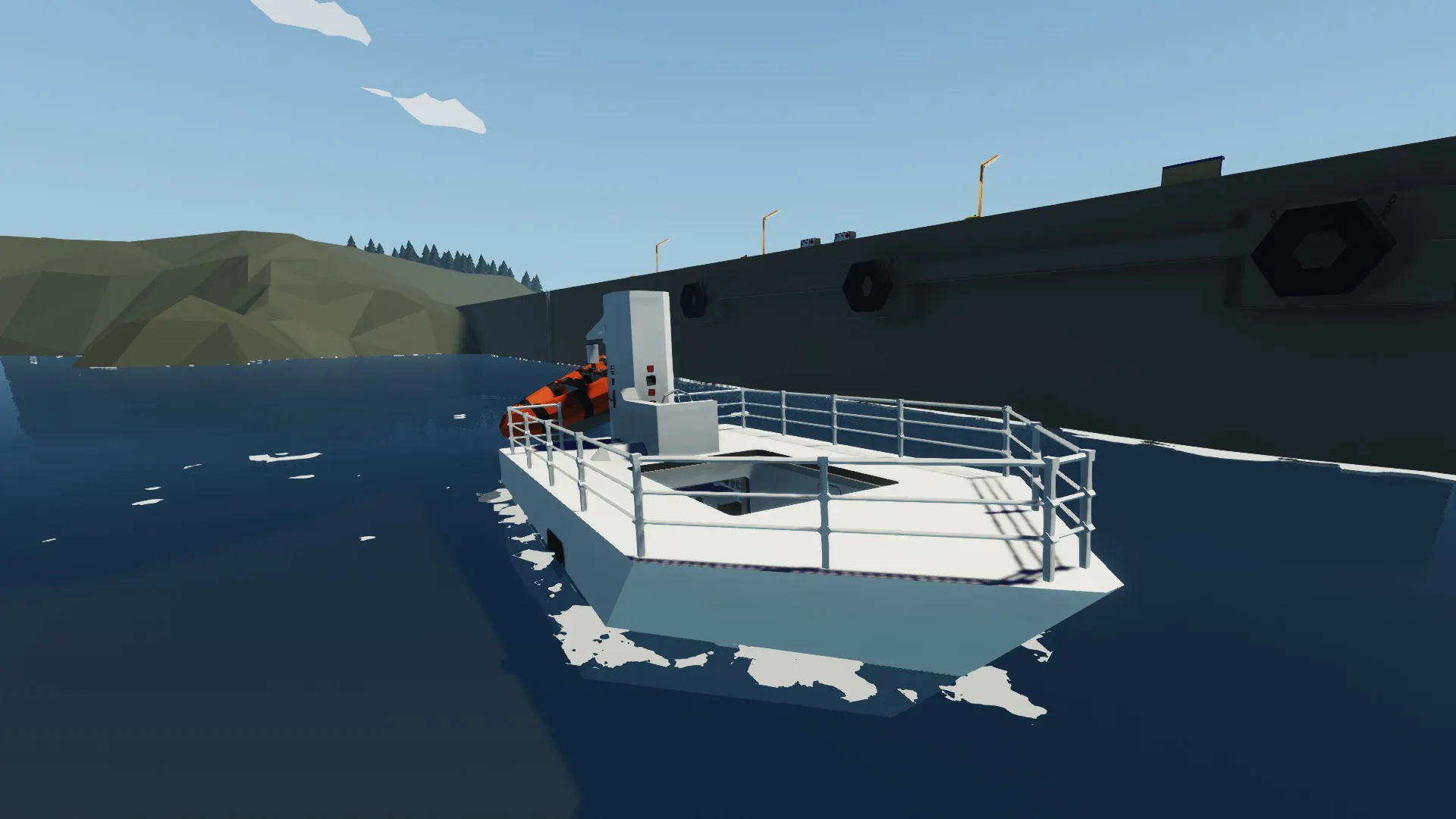 My first Steamboat, Version 1! Easy to drive, just put coal in the boiler, fire it up to 100 degrees, and BOOM! Ya got steam. Includes 2 bedrooms with lockable doors, an emergency Dinghy on the back, lights and signs to show the people in the boiler room what speed you need to go, a hatch with all sorts of equipment, and a cargo area!