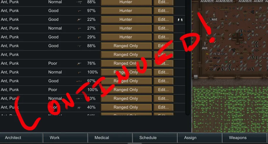 - Colonists will automatically pick up weapons that are allowed in their current loadout (and drop thier weapon if it is not allowed)