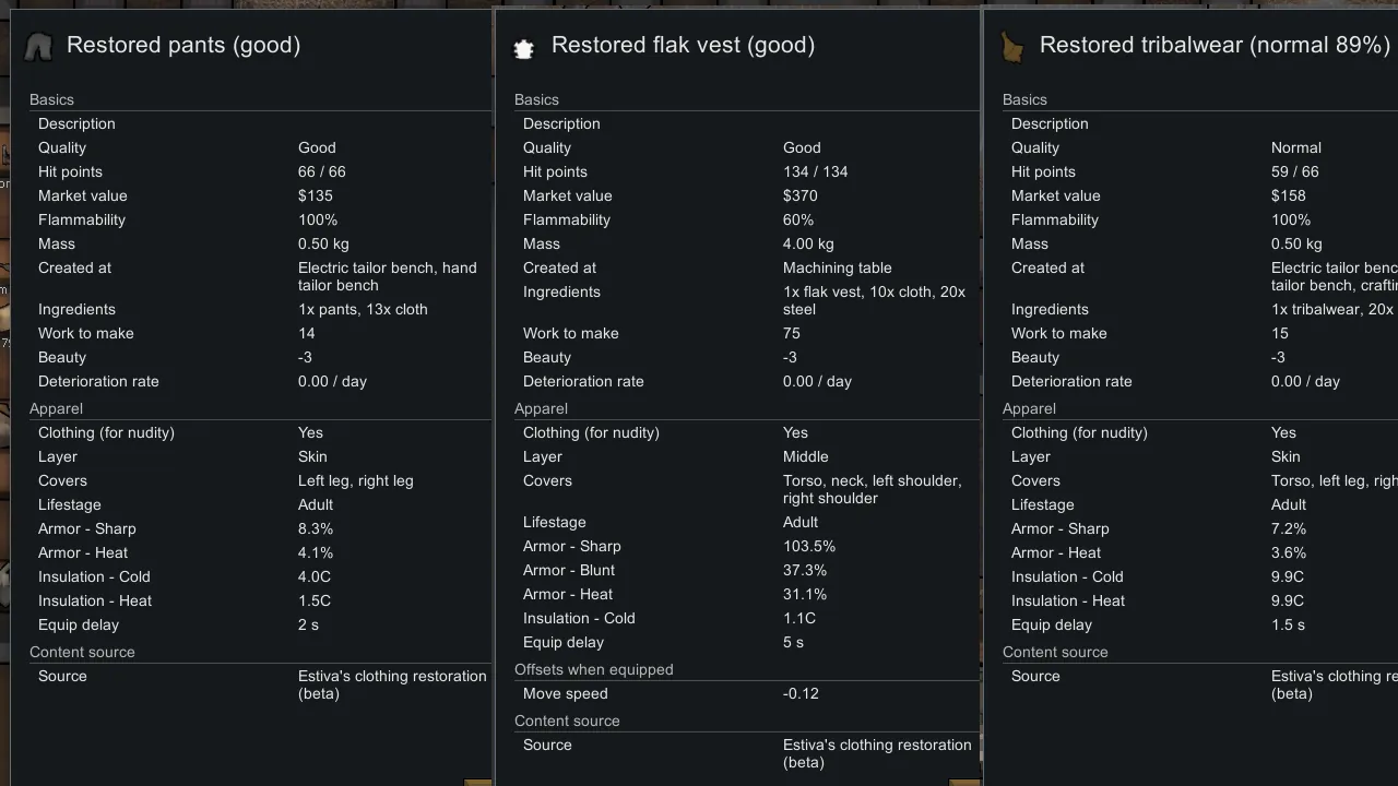 Duplicate every clothing and armor as a restored version. The restored version costs 33% of the original. It's a way to recycle raiders stuffs.