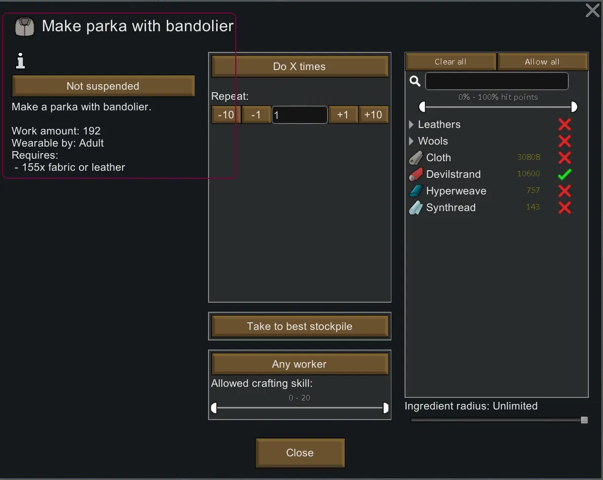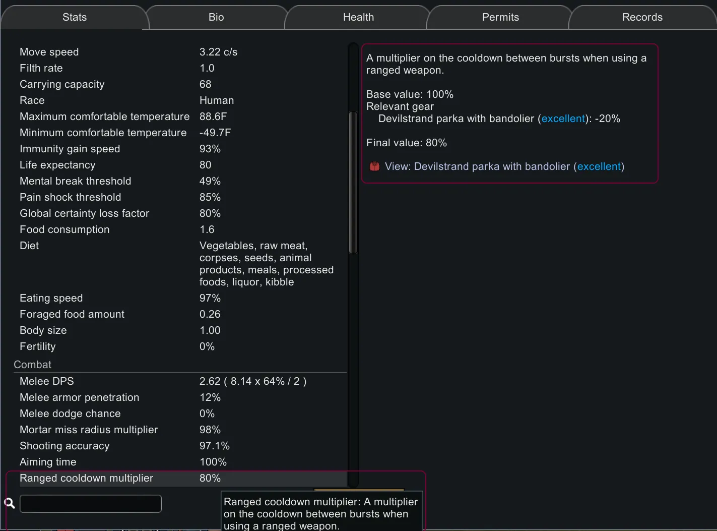 This mod adds a new type of parka. It includes the 20% reduction in ranged cooldown time from the heavy bandoliers. The material cost is the combined cost of the parka and the heavy bandolier. The time to produce it, is also the combined time of the two items. All other stats are the same as the original parka.