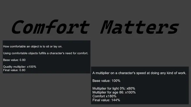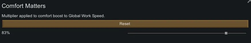 For example, if a chair has the comfort stat of 0.44 a multiplier of 144% is applied to Global Work Speed.