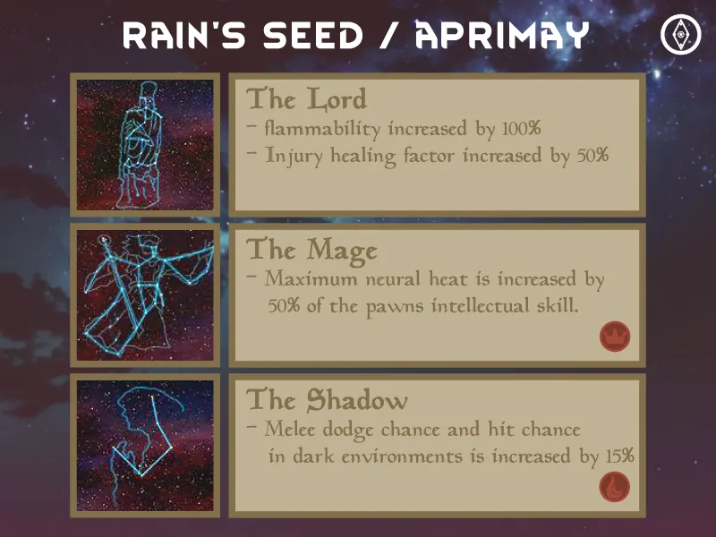 By default, every humanlike pawn will receive the birthsign that corresponds to their birthday. Each birthsign corresponds to a third of the appropriate quadrum, five consecutive days for each birthsign. For example, a pawn born within the first five days of Aprimay will be born under the sign of The Lord.