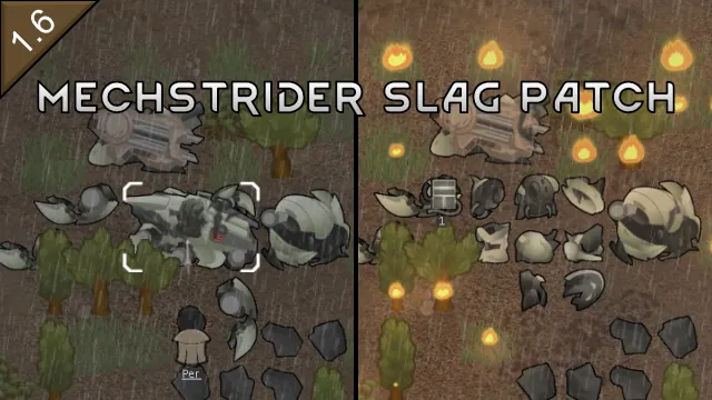 Have you felt the need for your Biotech mech debris to de-bris consistent? Bad joke, I know. This little patch will make turn your mechstrider drop the new Mechanoid Slag Chunks upon destruction, which are for all intents and purposes identical to steel slag chunks, just with the mechanoid detritus shapes instead of the generic steel slag.