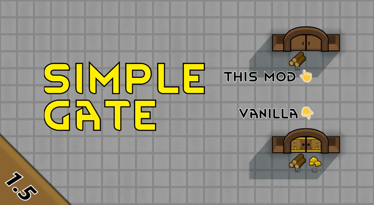This mod adds a 1x2 gate that use the same mechanism as ornate door, but does not need gold and build faster.