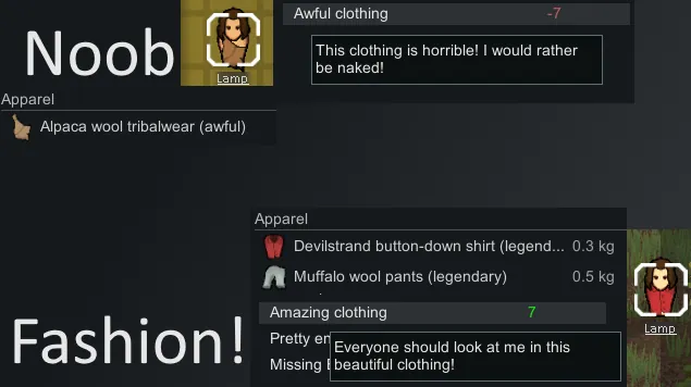 -Trait that colonists get buff/debuff depending on quality of clothing.