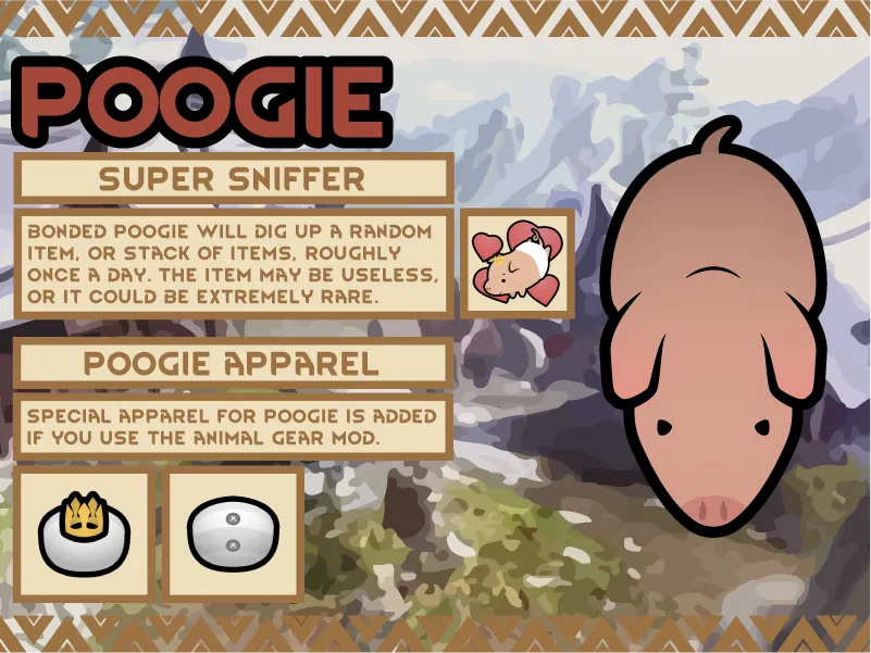 An adorable breed of pig, selectively bred for it's small size, and friendly personality. Poogie make for great companion animals, and can often be found wandering around villages befriending travellers.