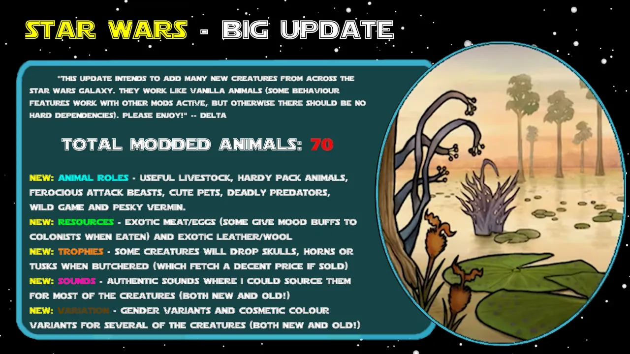 [url=https://steamcommunity.com/sharedfiles/filedetails/changelog/3497316713][img]https://img.shields.io/github/v/release/emipa606/StarWarsAnimalCollection?label=latest%20version&style=plastic&color=9f1111&labelColor=black[/img][/url] | tags: animals, collection