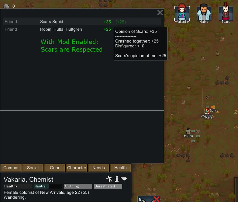 This mod simply changes the negative "Social" impact of being Disfigured (i.e. facial injuries) from a -15 penalty into a +10 gain.