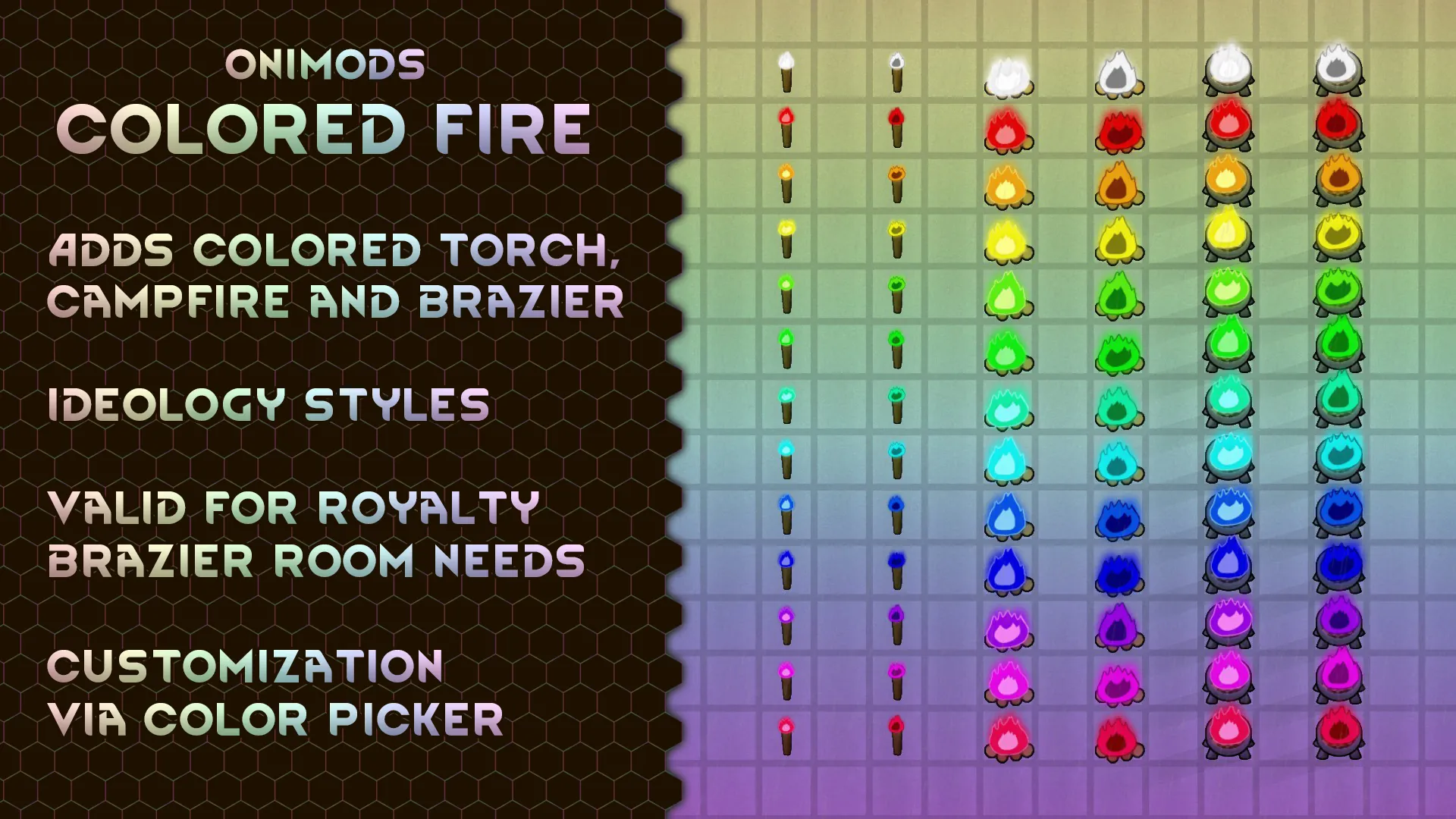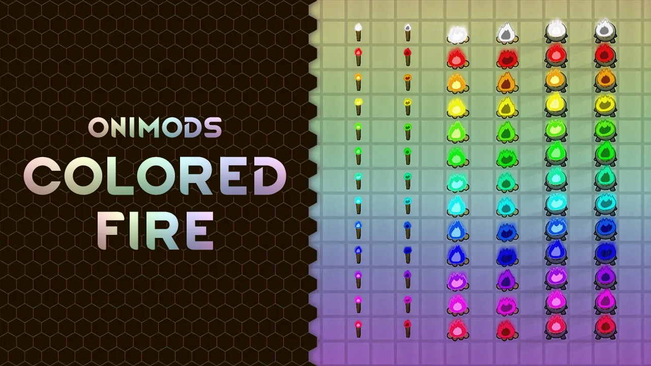 [b]Onimods - Colored Fire[/b] adds variant buildings with colorable exposed fires, like torches, campfires and braziers. The color of the flame can be selected via a color picker, copied and pasted just as with electric lamps.