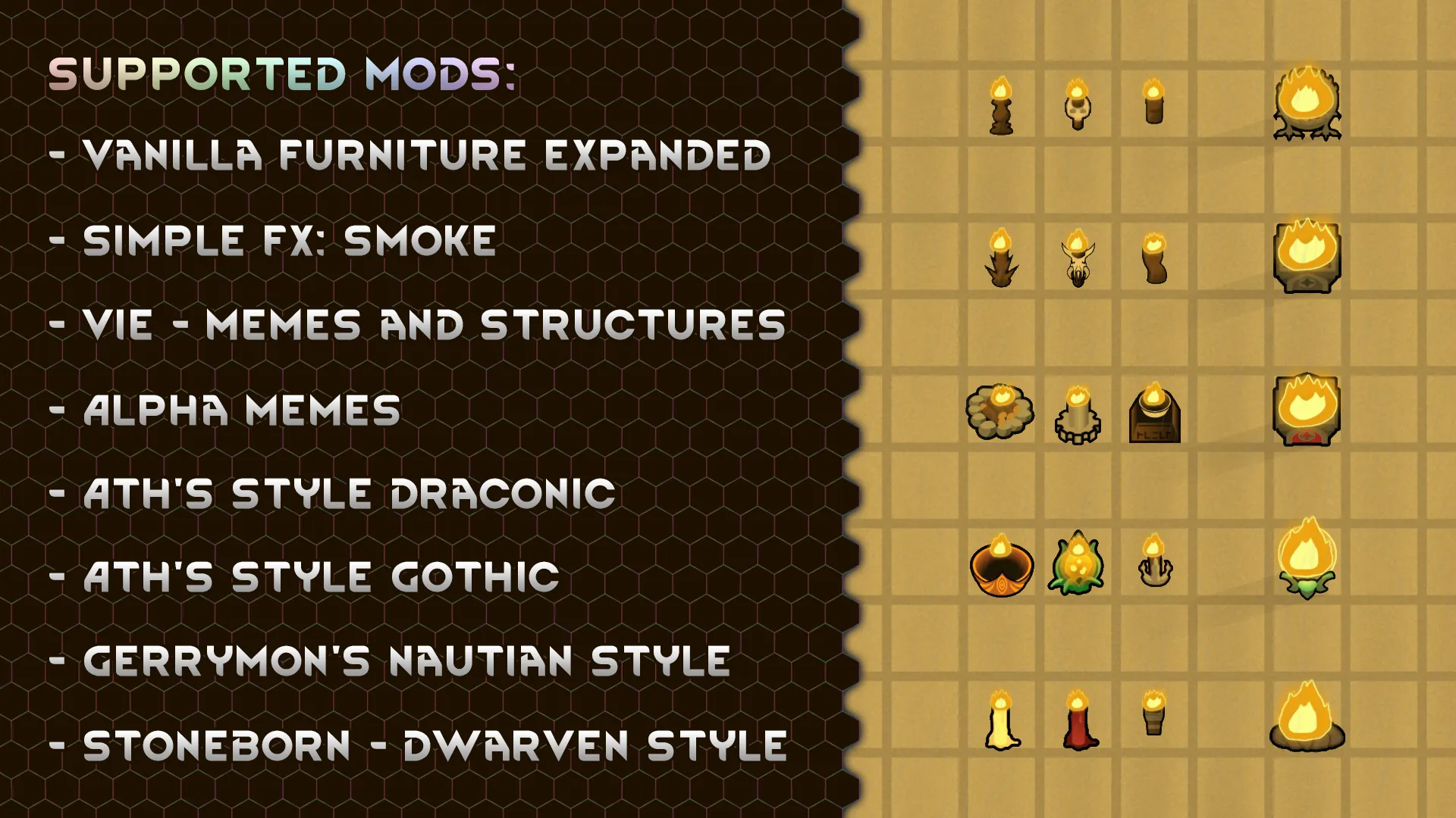 [b]A:[/b] If you find any mod that makes sense trying to add a ‘colored fire’ building variant, or that adds new styles for one of the variants base buildings (most likely torches or braziers), do leave a comment with a link to said mod and I’ll try take a look!