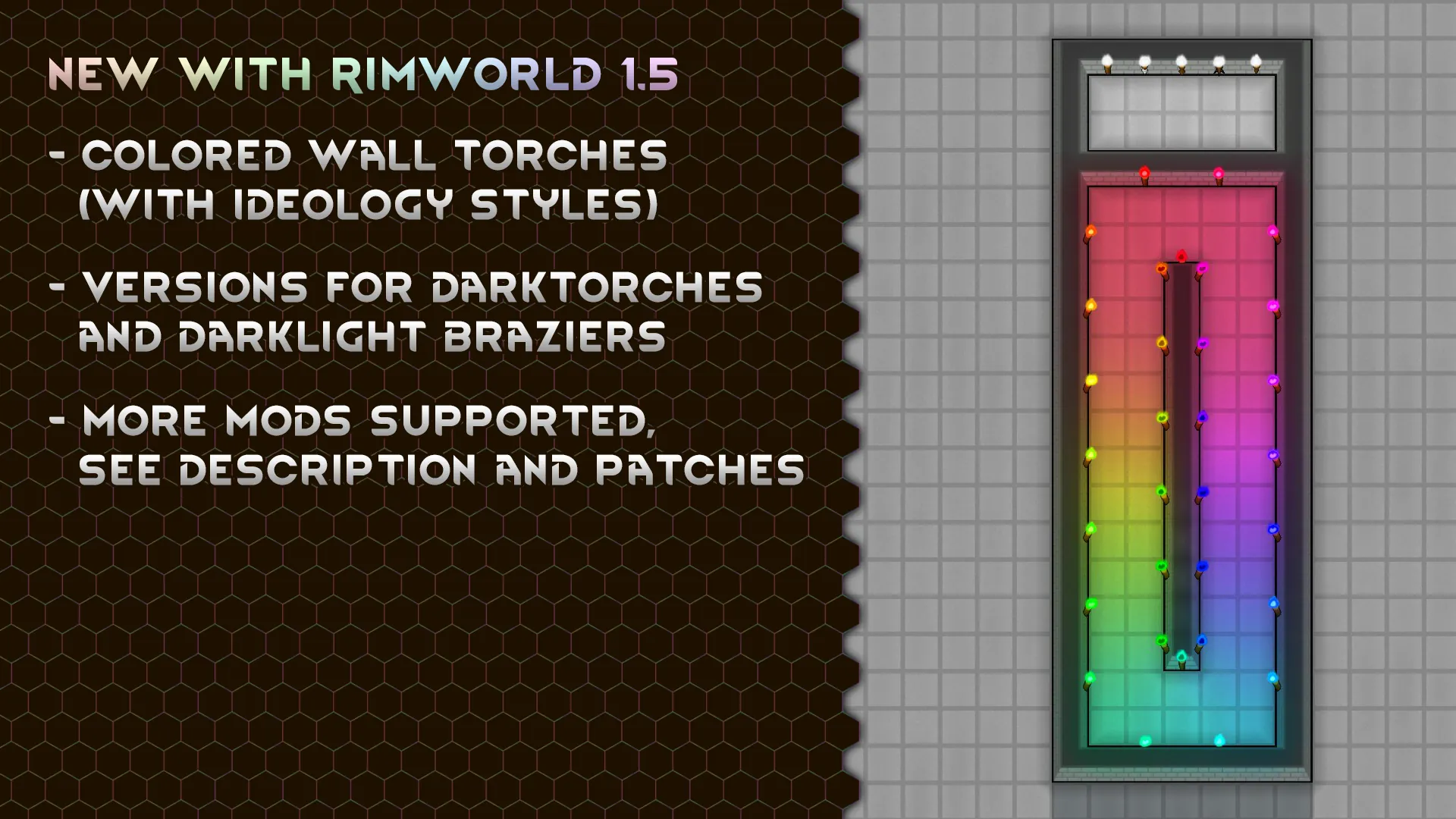 [b]Ideology DLC Support:[/b] Darklight color can be selected on the color picker, or via an added control (that toggles between the default orange color and the default blueish darklight color). Colored Torches and Colored Wall Torches share styles with their normal versions.