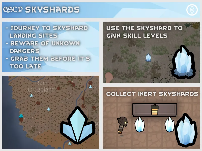 [*] Each skyshard will generate with an affinity towards a specific skill, at a varying level of strength. This dictates the skill that will be improved upon interaction, and how much it will be improved by.